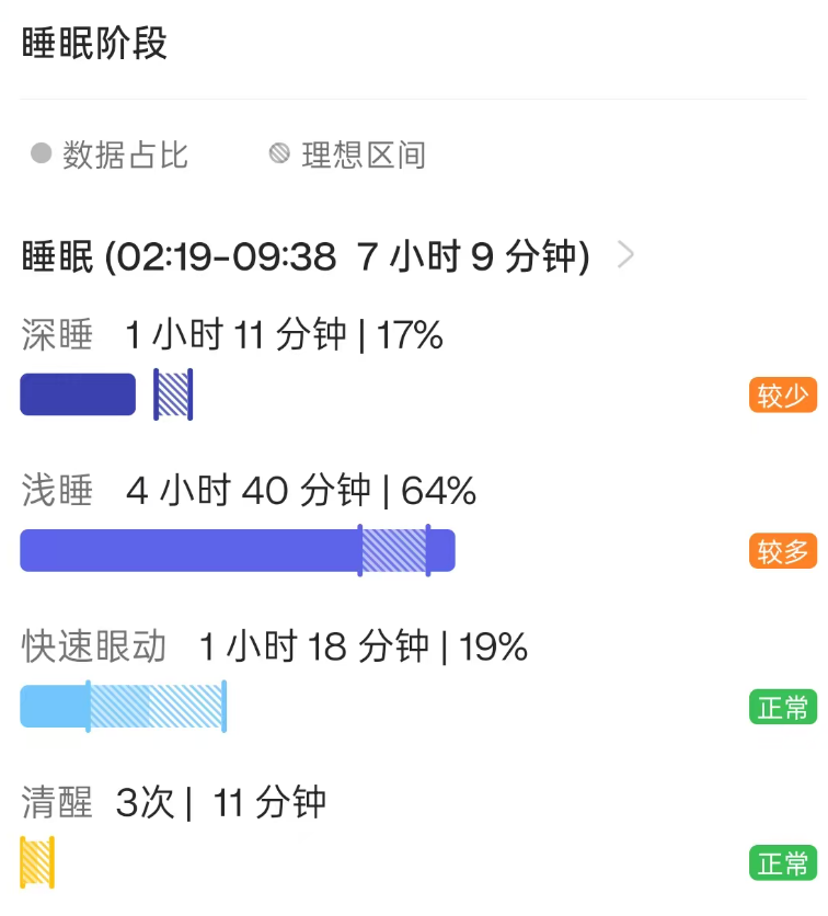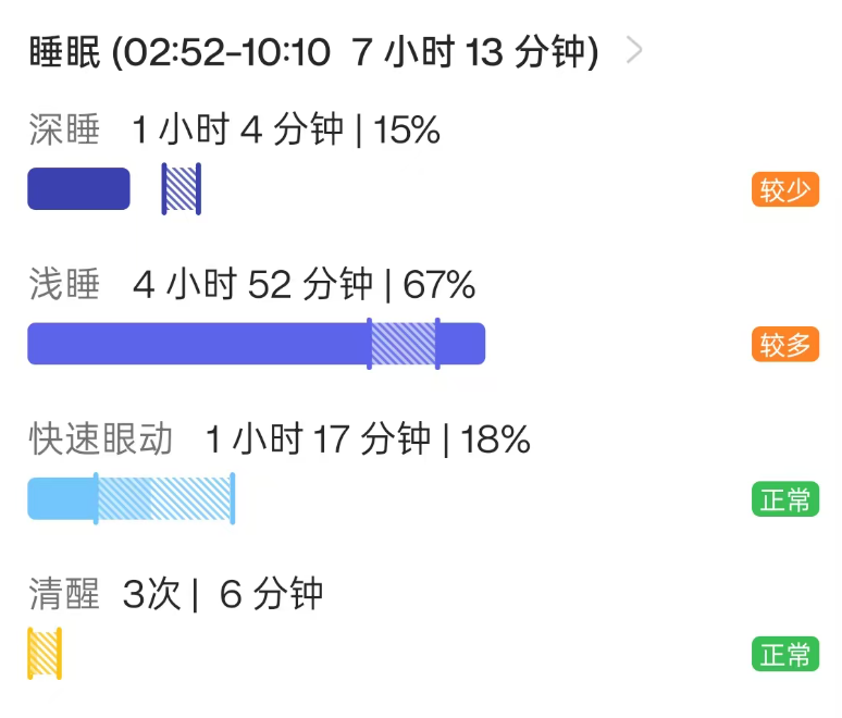 睡眠时长为6小时17分钟,深睡时长仅为57分钟,浅睡占比达4小时11分钟,明显偏多,只有快速眼动时间上处于正常阶段,清醒次数达到6次,不少但还算正常。作为对比,小雷翻出了以前的睡眠记录,找到一个睡眠时长和入睡时间都接近的样本。
