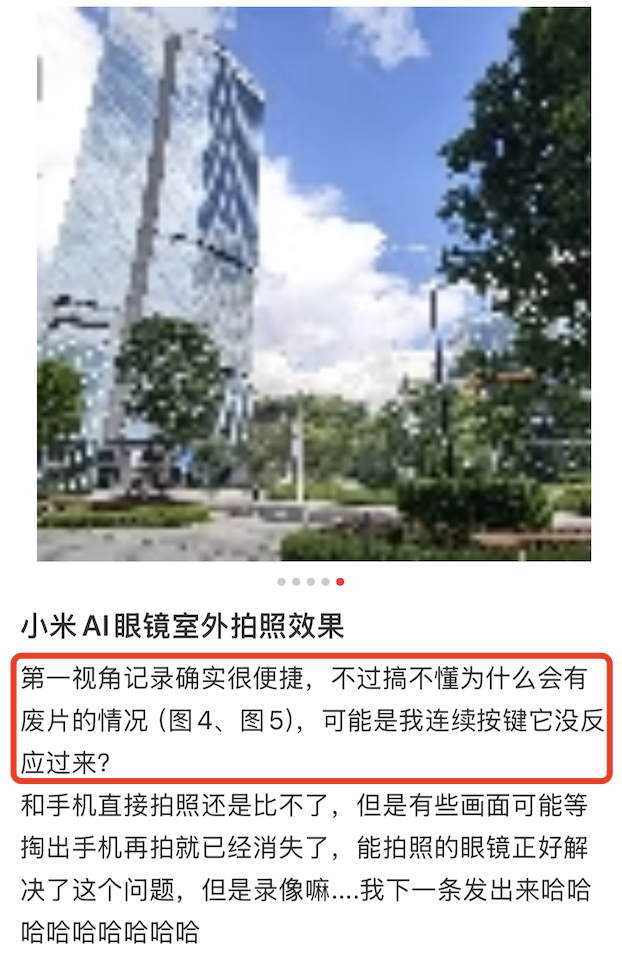 “我有华为的,这种真的戴着玩玩还行,几个小时就觉得压着鼻梁,全天戴太重了,从玩具角度就贵了。”“小米AI眼镜拍摄时长才10分钟”“小度AI眼镜不能发布指令打电话,需要手机进行操作”“Rokid Glasses误唤醒率太高了,拍照对焦慢,提词功能60k达不到官方说的3w字”。