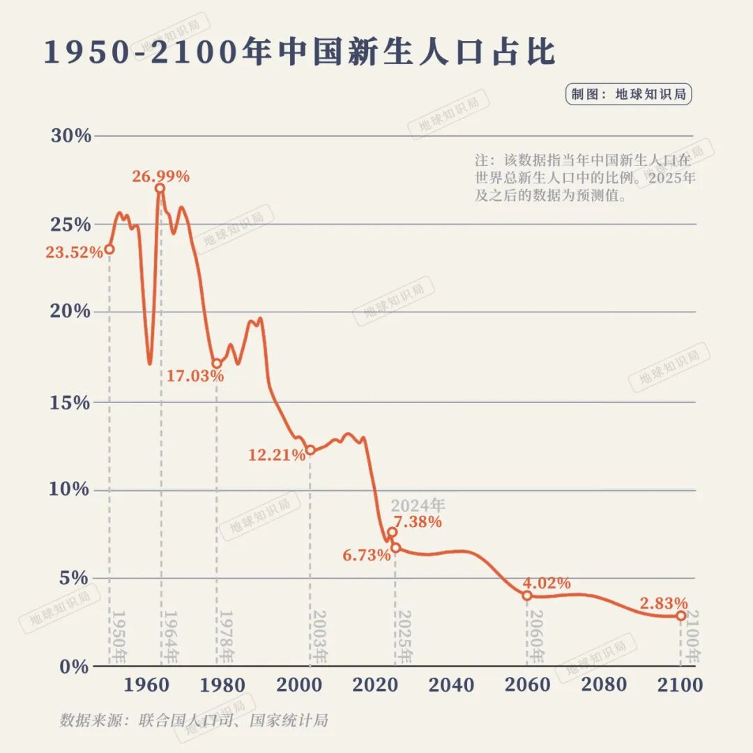 从历年出生人口来看,中国出生人口占全球新生儿人口比例最高点是1964年,达到27.3%。随后逐步下降, 1976年跌破了20%,2020年跌破了10%,如今更是可能跌破7%。