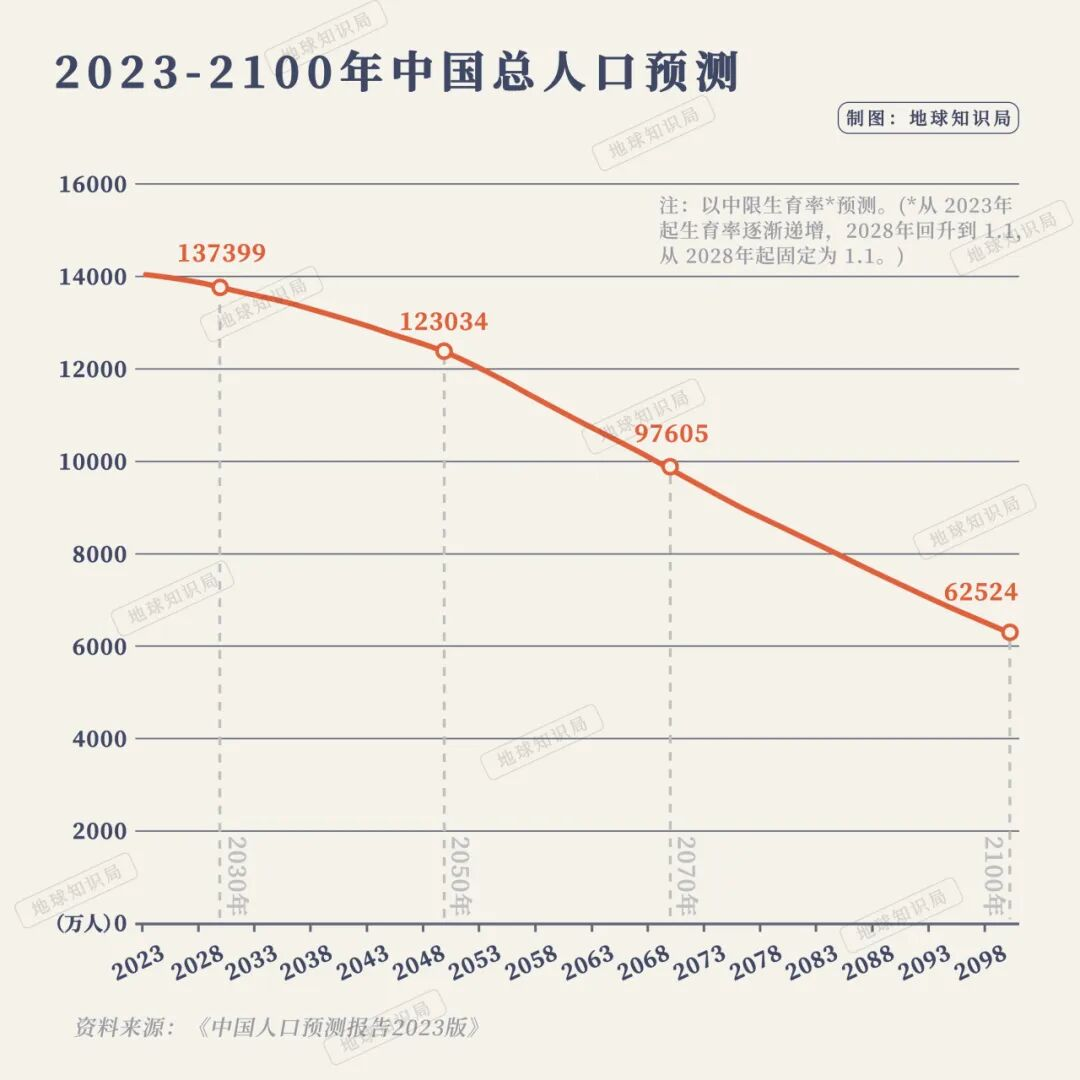 《中国人口预测报告2023版》 的人口预测值得参考,根据这份报告的预测,若保持现在的生育率不变,到2030年中国人口将降为13.74亿,到2050年中国人口将降为12.30亿。