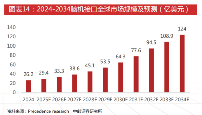 数据显示,全球脑机接口市场呈现持续增长态势。Precedenceresarch统计数据显示,2024年全球脑机接口市场规模为26.2亿美元,预计到2034年将增加到约124亿美元,从2025年到2034年的复合年增长率为17.35%。