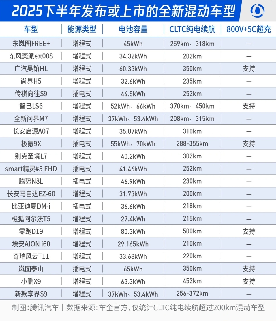 从2025下半年开始,更多全新增程车和插混车型便陆续问世,其中包括了一批最新的“超电”混动车型。8月有奕派eπ008增程版、昊铂HL增程版、尚界H5增程版;9月则有智己LS6增程版、全新问界M7增程版、新款长安启源A07增程版;进入10-11月,更是有极狐阿尔法T5增程版、零跑D19增程版、小鹏X9增程版等一大批新车,甚至小米汽车的YU9增程SUV也被多次曝光。