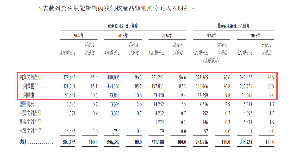 铜师傅试图通过多元化寻找增长点。不过,被寄予厚望的塑胶潮玩业务,2024年收入仅1400余万元,占比不足3%,且依赖外部制造商生产;黄金文创业务2024年才刚刚起步,收入占比微乎其微。