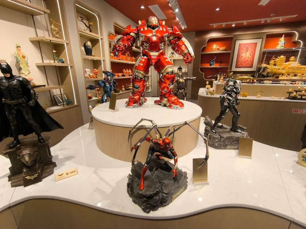 铜师傅主要售卖的就是铜制工艺品。盐财经记者在深圳线下门店里注意到,铜师傅的展柜陈列的,既有“大圣传奇”、变形金刚等热门IP联名款,也有铜葫芦、财神雕塑、“聚宝盆”等经典款铜制品。