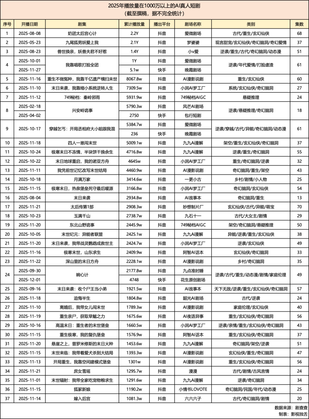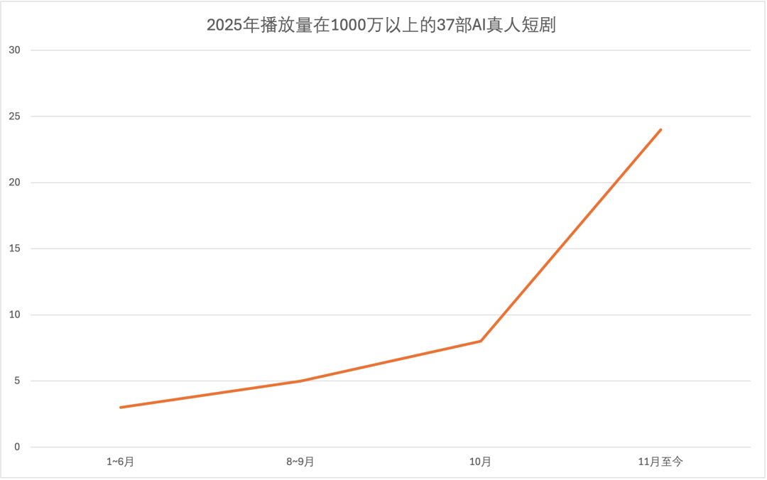 在37部AI真人短剧中,上半年1~6月上线的作品为3部,下半年8~9月上线的作品为5部,10月为8部,自11月起则有24部。这直观印证了,行业经过上半年的技术与内容沉淀,在下半年成功实现规模化增长。