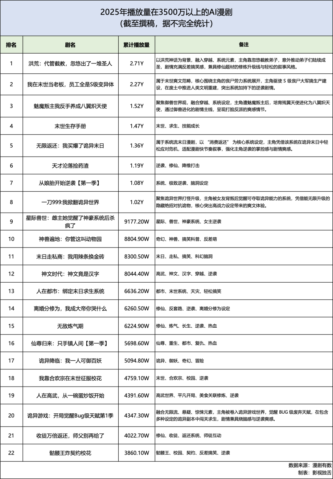 除了古装玄幻题材,末世题材成为两大赛道共同的“破圈密码”,而AI技术正是其实现降本增效、规模化产出的核心支撑。