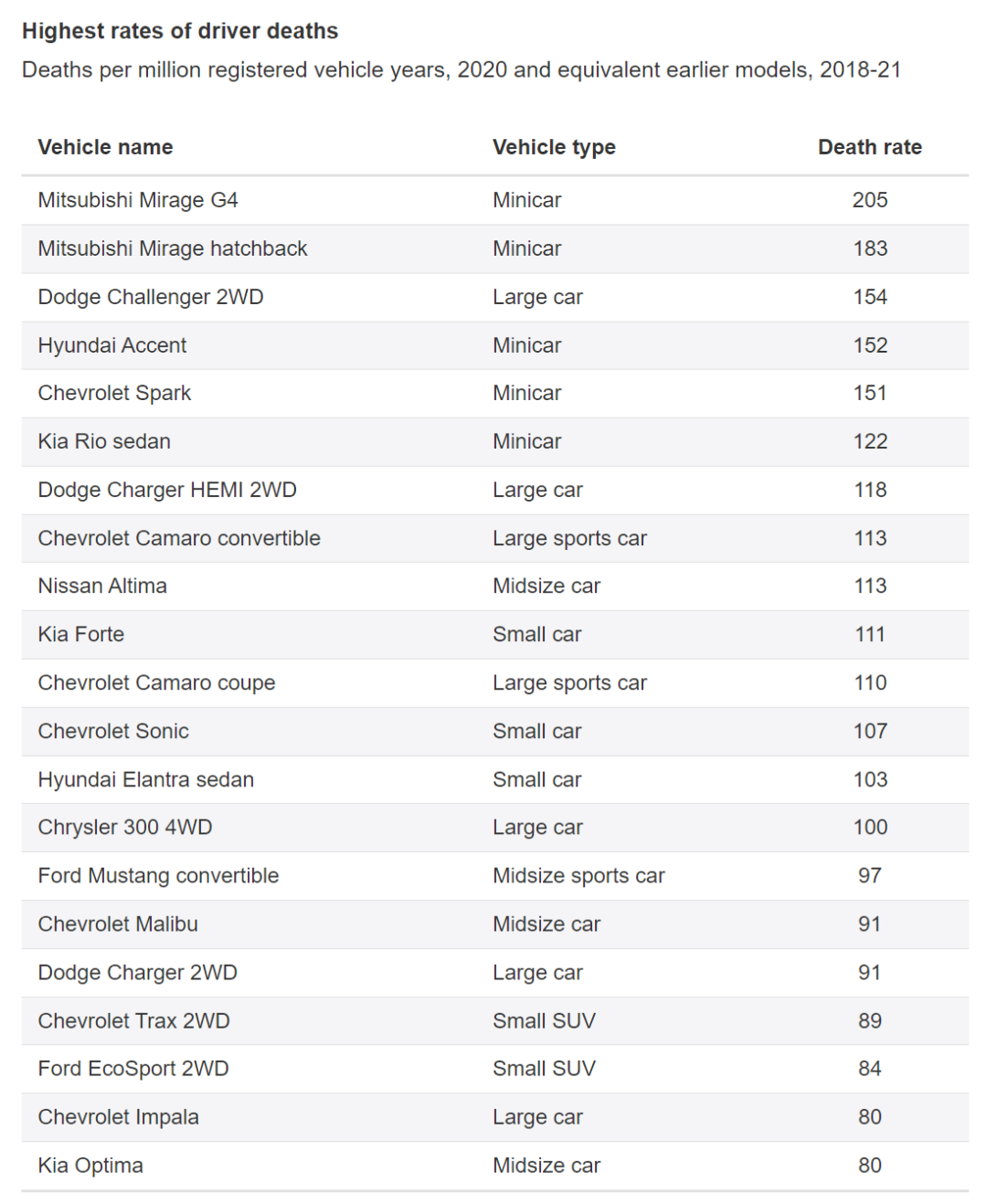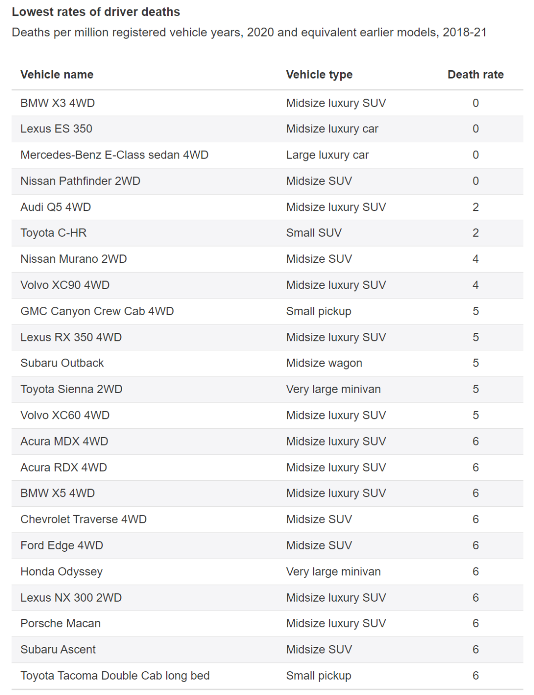 另外,IIHS因为是保险机构办的,他们也很在意驾驶者的画像,所以他们统计发现肌肉车因为驾驶行为导致死亡率常年偏高。同时,我也想问下,像下图这种死亡率最低的车型统计,如果单从这个榜单看,你觉得合理吗?