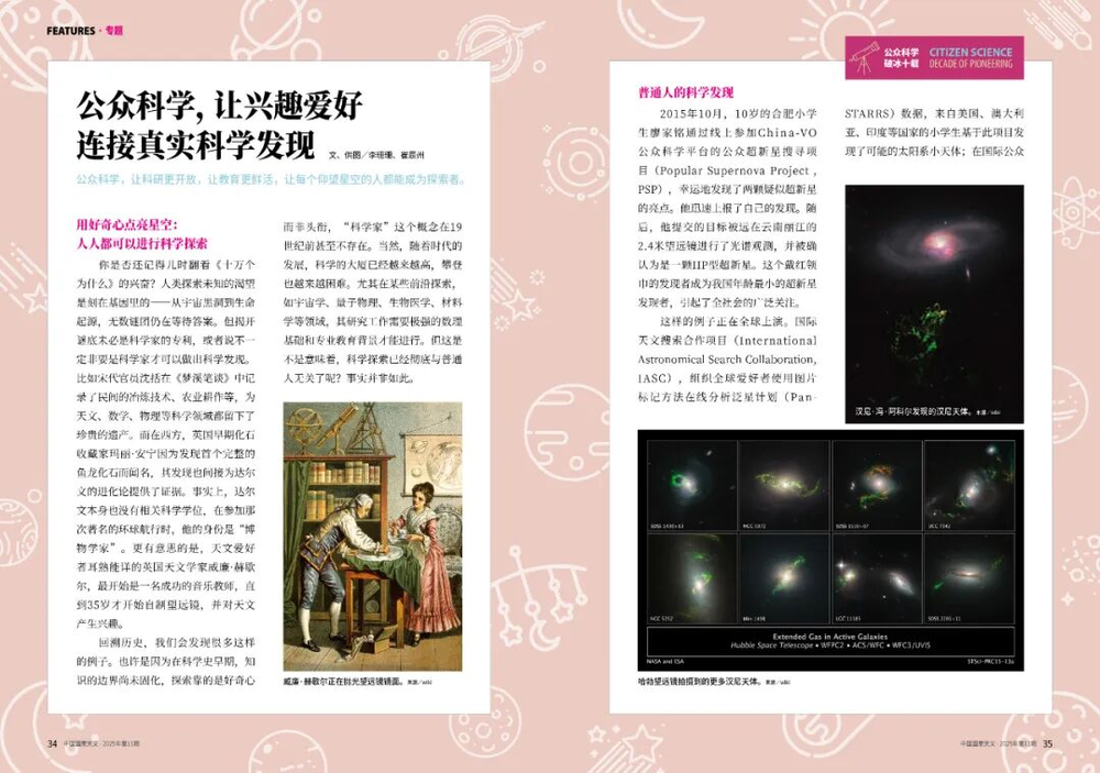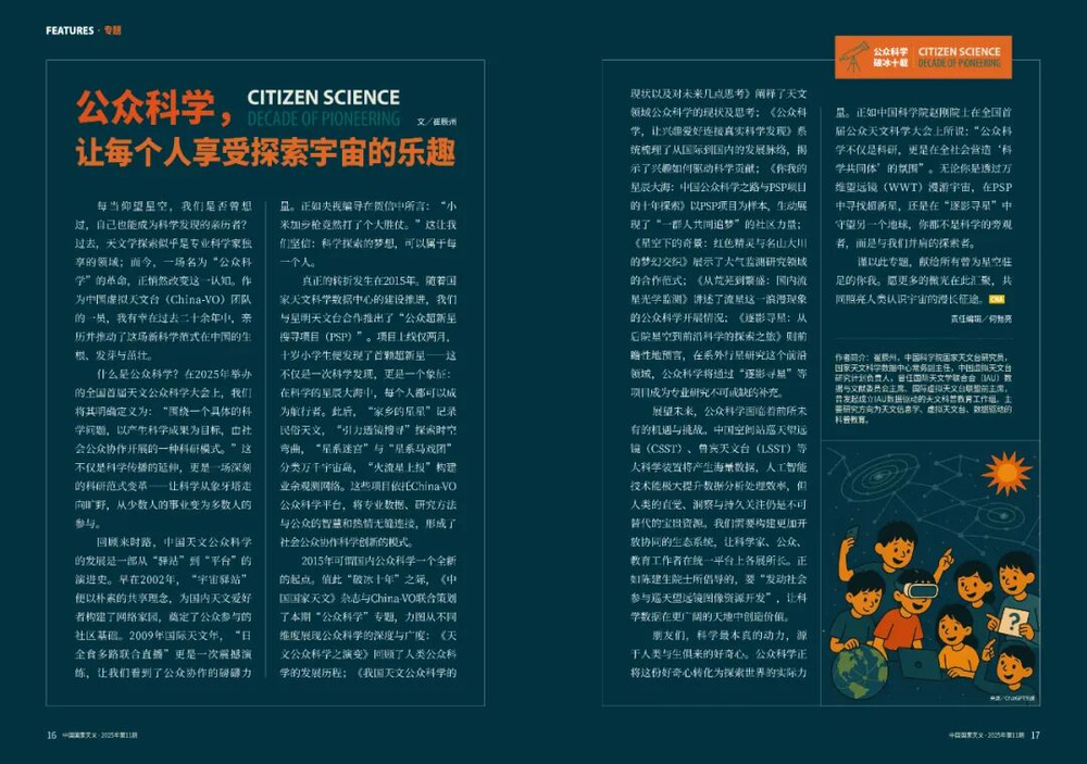 大数据天文学时代来临,海量观测数据亟待破解。公众科学通过创新技术赋能与场景拓展,正成为全民参与宇宙探索的新范式,中国天文事业将借此开启“人人都能做天文”的普惠时代。