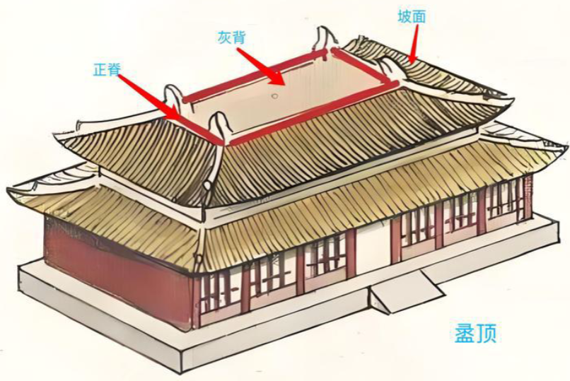 而其他的几栋楼,两边则都是“庑殿顶”或“歇山顶”,上面不是平的,有一条正脊。