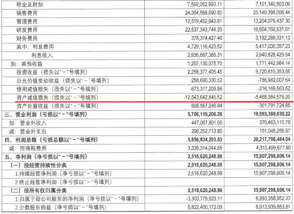 仔细分析收益明细,资产减值一栏或许可以给出答案。相比去年同期(2024年1-9月)的-54.7亿元,今年亏损同比大幅恶化约129%,数值高达-125.4亿元。其中,第二季度是重灾区(-88.8亿元),第一和第三季度分别为-0.5亿元和-36.1亿元。