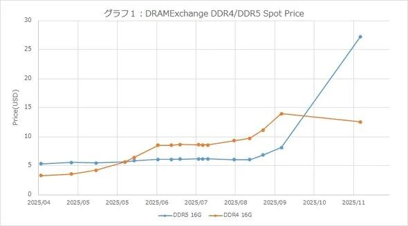 图1:DDR4/DDR5现货价格来源:基于DRAMExchange数据由笔者制作