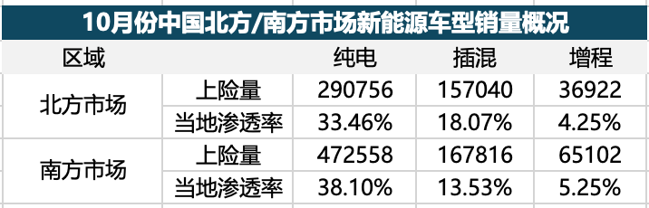 今年10月份,北方地区乘用车销量86.9万辆,南方为124万辆,分别占据41.2%和58.8%的市场份额。南北地区的新能源渗透率相当,10月份都超过了55%。