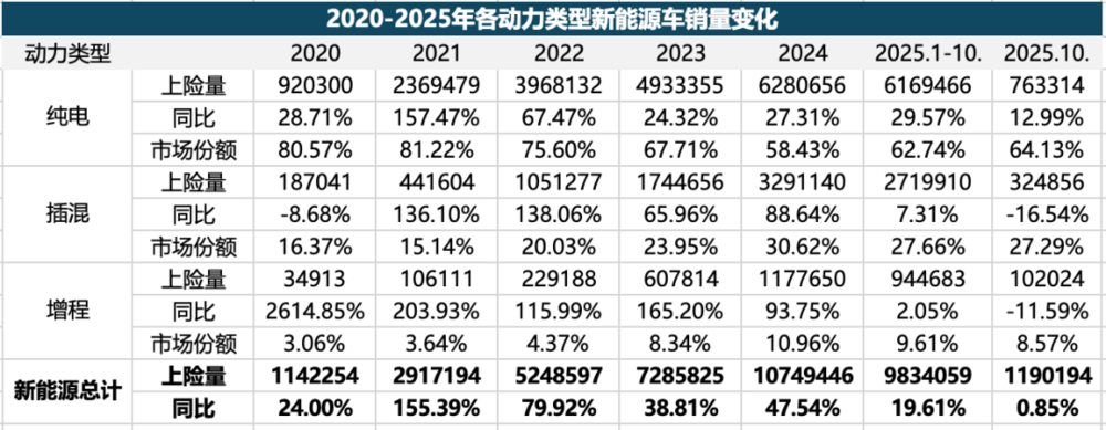 上表统计了2020-2025年各动力类型新能源车的销量变化,三大动力类型中,纯电一直是销量和份额最高的,但是随着2020年后,插混、增程车型的快速增长,纯电车型在新能源市场中的份额逐步下滑,2020年曾占据新能源市场八成以上份额,到2024年一度萎缩到58.4%。