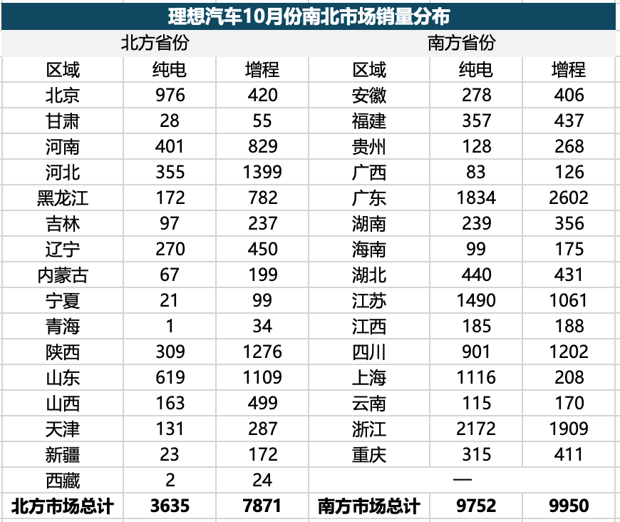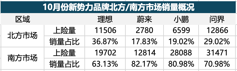如上表,理想汽车今年10月份上险量3.12万辆,其中北方市场销量1.15万辆,只占全国总销量的37%,几乎和南方市场差了一倍。