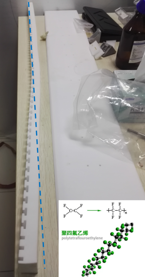 为什么是弯的?我们后来和化工专家专门讨论了这个问题。特氟龙的性质非常奇怪,它在19℃的时候会发生相变。加工的时候,温度传递并不均匀。比如这个地方加工温度过高,发生了形变但传不到这边去,这边就跟着不变。因此,做大了很容易出现形变的问题,不能满足我们的要求。我们和加工车间、化工专家反复地调整工艺流程,最终解决了大零件的形变问题。