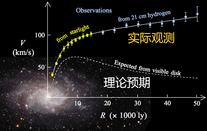 实际上,我们观测发现——距离远的恒星,速度并没有减弱。这就预示着需要大量的、看不见的物质,来提供这样强大的引力,否则这个恒星就会被甩出星系。