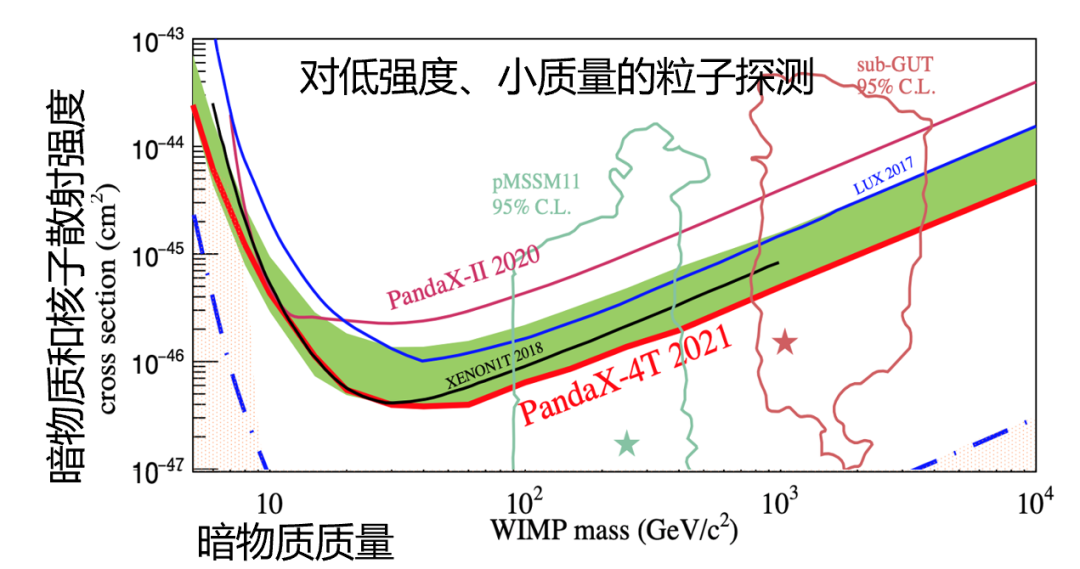 仅仅95天的试运行,我们就完成了它的分析,并发布在国际会议上。这个是它的结果图:横坐标是暗物质质量,我们也不知道暗物质质量是多少,这是一个自由的参数。纵坐标是暗物质和普通物质相互作用的强度。暗物质就像一条在水里游的鱼,如果游得浅,我们就先探测这些强度高的信号。我们不断地扫描,发现游得浅的地方都被扫描完了,然后就要开始往深水区扫。