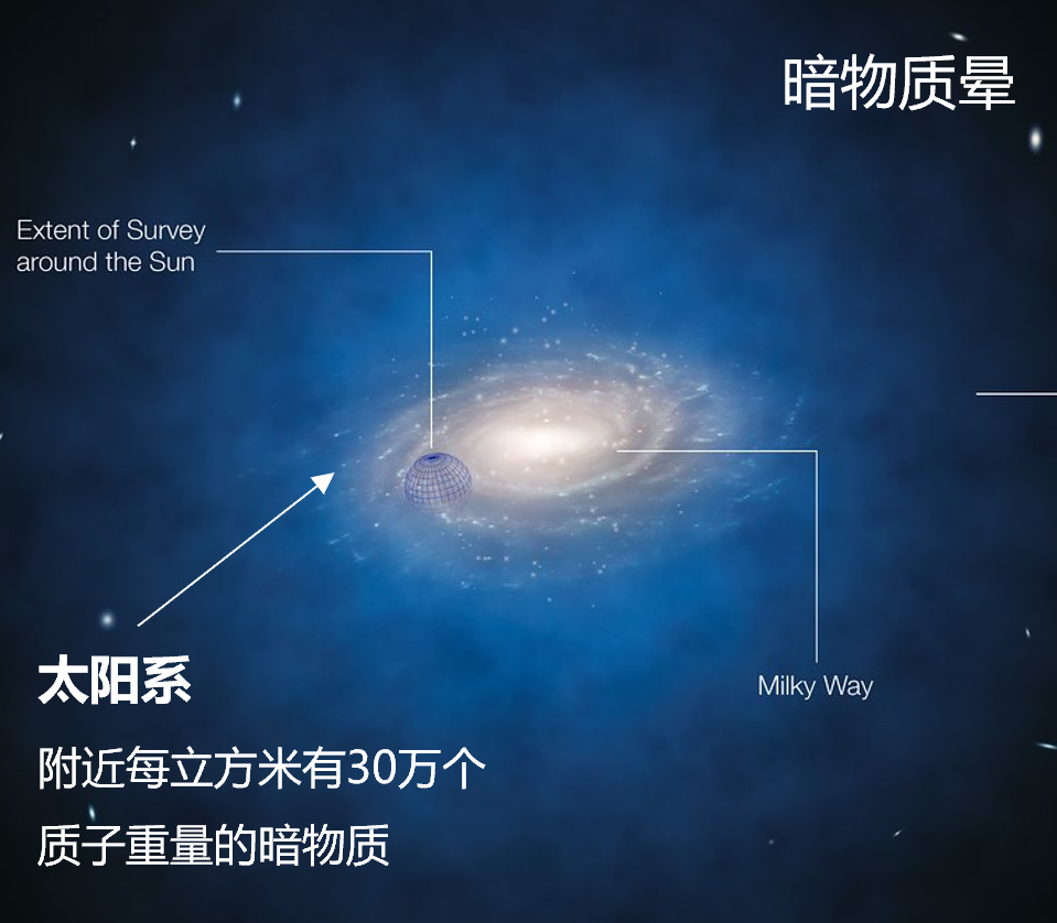 因此,我们需要一种更直接的方式来寻找暗物质。哪里才能完成这件事呢?其实是银河系。银河系85%的成分是暗物质,即使在我们周围,每立方米的体积就有30万个质子质量的暗物质。它像雾霾一样笼罩在银河系,太阳系以220 km/s的速度围绕着银河系旋转,它穿越雾霾和暗物质发生碰撞,而我们就是来寻找碰撞的信号。