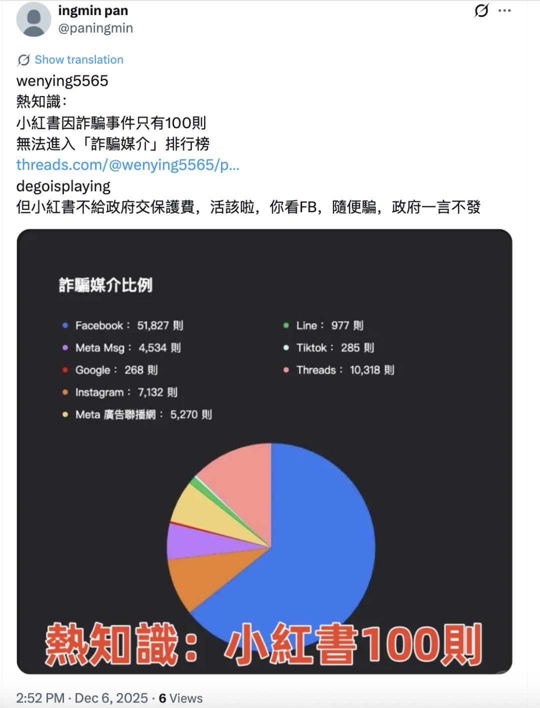 很多台湾地区的老百姓就开始在网上为小红书打抱不平,他们找出了最近一个月的台湾诈骗媒介比例排行榜,Facebook有51827则疑似诈骗通报案件,Threads有10318则,而小红书只有100则。