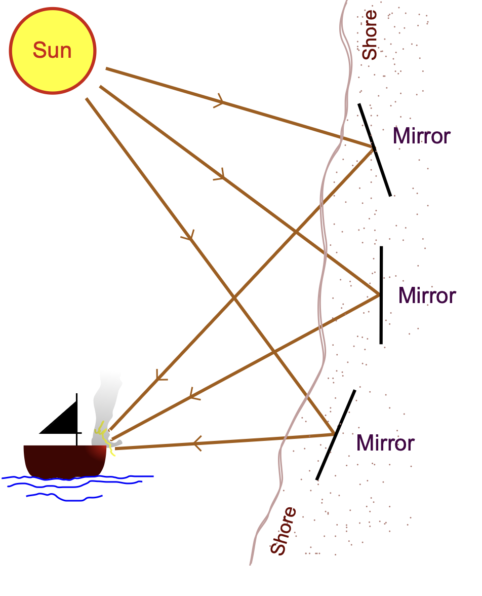 具体原理如图,就是利用多面镜子反射太阳光,将太阳光聚焦到一点,就能用来点燃进攻的罗马船只。这属于典型的“道理我都懂,但……”。