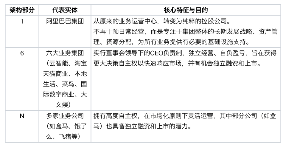 在组织层面,首先大力推行“1+6+N”的变革,削减中层冗余,旨在打造一个更扁平、更敏捷的组织架构,以提升决策与执行效率,如下图所示。在此基础上,进一步变革,整合为四大业务板块,即阿里巴巴中国电商集团、阿里国际数字商业集团、云智能集团以及所有其他业务,为战略聚焦打下基础。