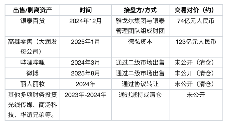 在业务层面,果断出售或剥离增长乏力或与核心战略协同性不高的非核心业务,特别是线下重资产和部分财务投资,如下表所示。
