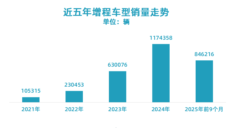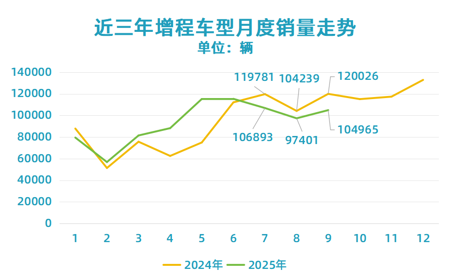 2025年7月、8月、9月,国内终端的增程车销量分别为10.69万辆、9.74万辆和10.50万辆,分别同比下降-11%、-7%和-13%。