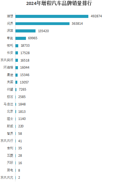 2024年,增程总销量破百万,23个品牌卖增程,理想市占率降到40%左右,但主力玩家还是理想、问界、深蓝、零跑这几家。