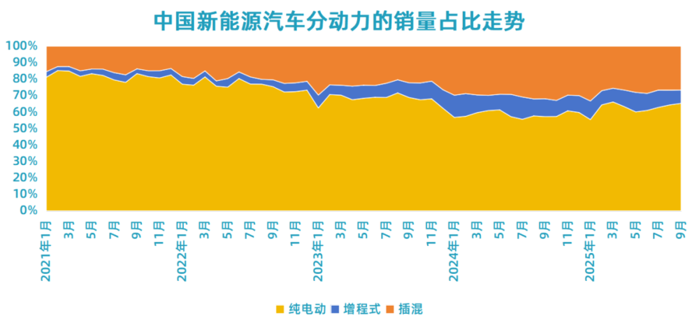 总盘子在增长,但分析动力系统分布,纯电占比一开始一路走低,但2024年春季以来,已经多次反弹。到2025年1月创出55.44%的历史最低值之后,就开始了大幅回升。今年3月,纯电比例就已经回到了66.14%的近期最高占比,9月也有65.28%。