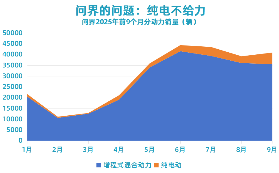 反而是问界对增程车型的依赖症比较严重,甚至不如理想转型快。尽管其纯电比例也在提升,但是直到9月份,占比都只有8%左右。