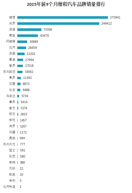 2025年前9个月,已经有29个品牌卖增程车,理想的市场份额降到33%。除了理想、问界、深蓝、零跑四大品牌,阿维塔、岚图的增程车型销量也突破了2万辆。
