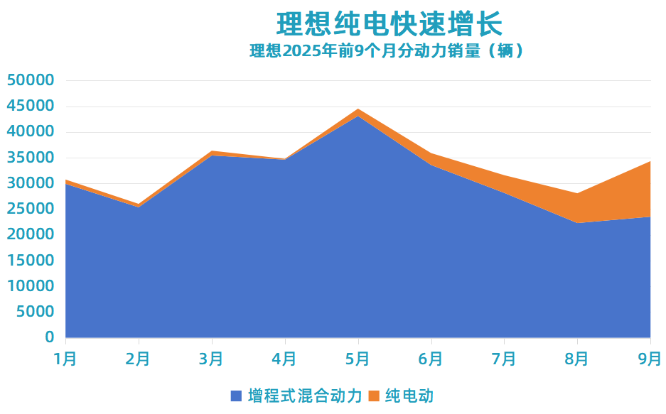 在理想MEGA发布一周年后,理想推出MEGA HOME年度改款,口碑也实现逆转,销量增长。后续随着理想i8和理想i6两款纯电SUV的发布,理想纯电车型销量大幅增长。到9月份,理想纯电车型销量已经破万,占比已经超过30%。按照这一趋势和理想汽车的内部预测,到2025年底,纯电车型销量占比可能达到50%。