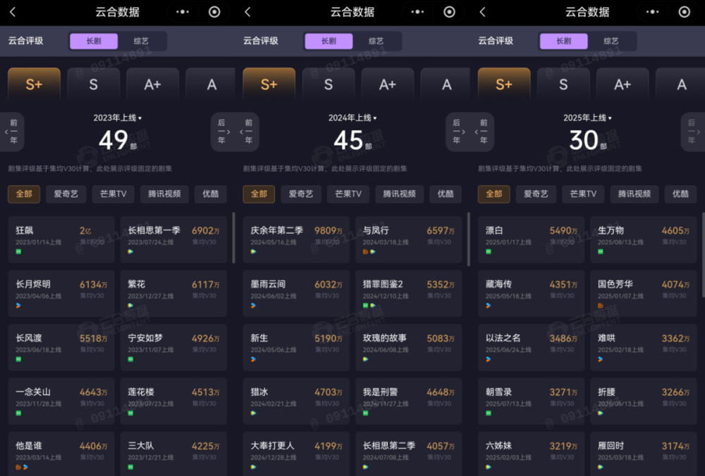 从云合数据统计的集均V30(每集上线30天后的累计有效播放量除以总集数)年榜可以看出,无论是达到S+级别的剧目数量,还是头部剧集的数据,近三年都呈现出下滑趋势。