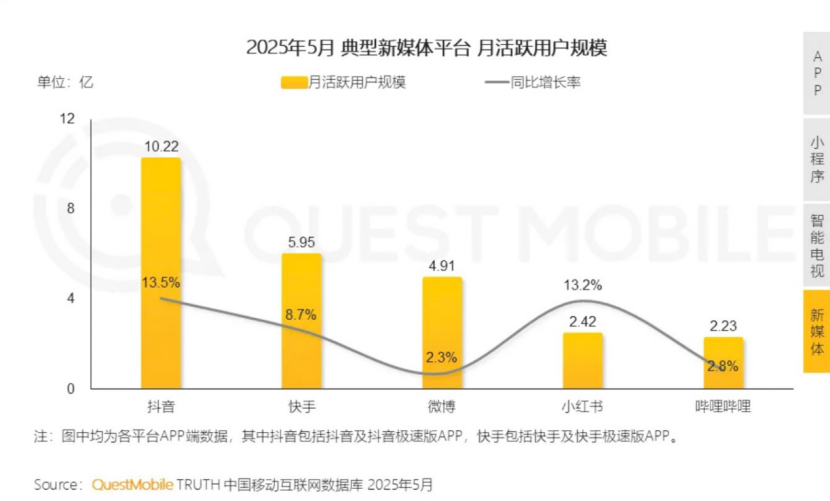 但是月活跃规模并不是第一梯队。QuestMobile数据显示,2025年5月,小红书的月活跃用户规模为2.42亿,相比之下抖音为10.22亿,快手为5.95亿。