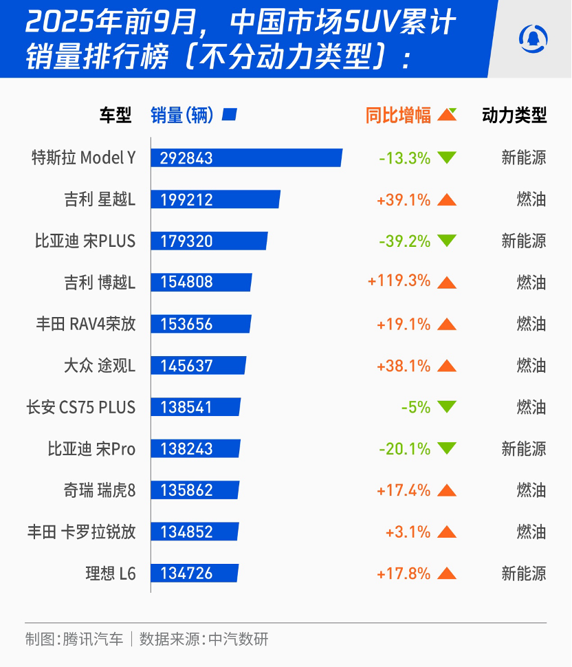 翻看中国车市SUV全品类零售排行榜,据中汽数研统计,2025年前9月,特斯拉Model Y以29.34万辆销量断崖式领先。 但容易被外界忽视的是,星越L这款燃油车占据第二位,同比增长近四成至19.92万辆,去年它就是燃油车SUV的中国销量冠军。