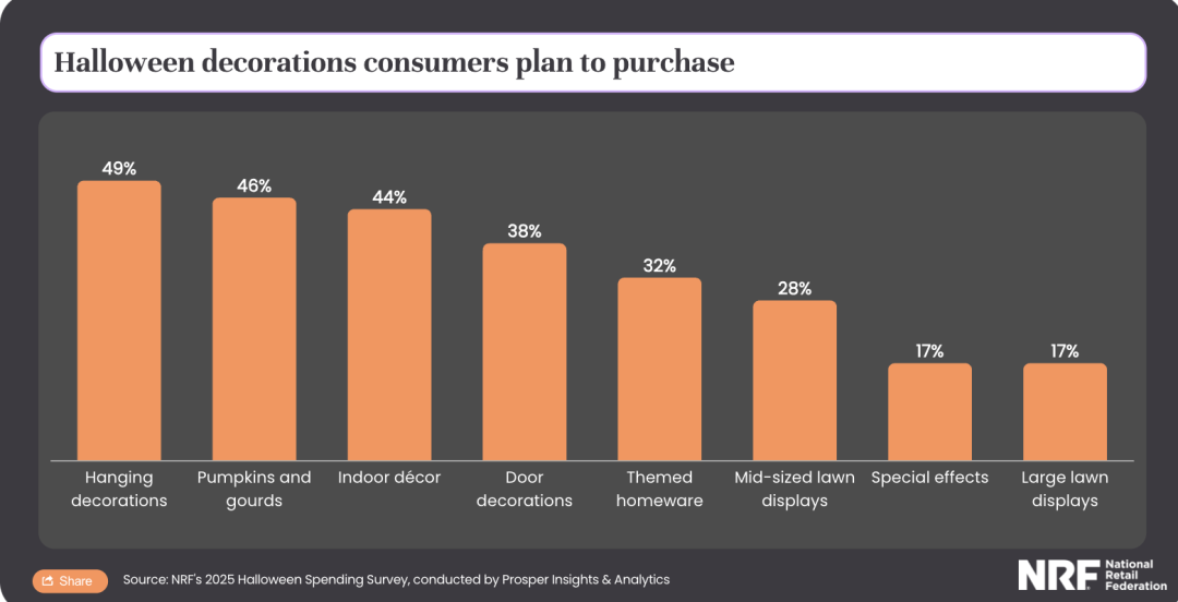 当然,万圣节经典款依然难以超越。灯饰、蜘蛛网和其他悬挂装饰品是最受欢迎的选择,其次是南瓜和葫芦。但现在多了巨型骷髅、无头人体、断肢儿童、黑漆漆的墓碑。