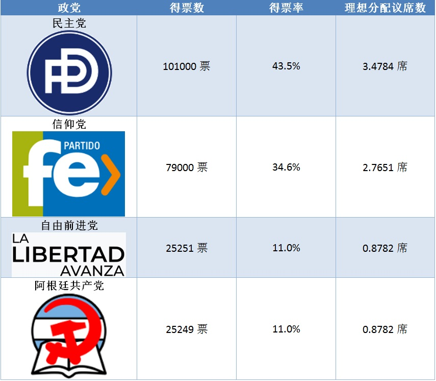举一简化模型:假设有一简化的“阿根廷”——有四个政党争夺8个议会席位,有效票23万张,选举结果如下: