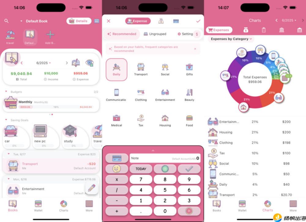 在主页模块中,应用会展示当月总收入与总支出,不仅按类别呈现,还通过进度条提示当前支出与预算之间的差距,以帮助用户合理规划消费。其余三个模块分别承担不同功能:一是以饼图形式对收支结构进行可视化分析,方便用户识别占比过高的支出类别并适时调整;二是日历视图,支持按日期筛选和查看消费记录,增强支出的可追溯性;三是以类别为维度,通过进度条直观显示各类别花销情况,帮助用户更清晰地了解自身消费习惯。