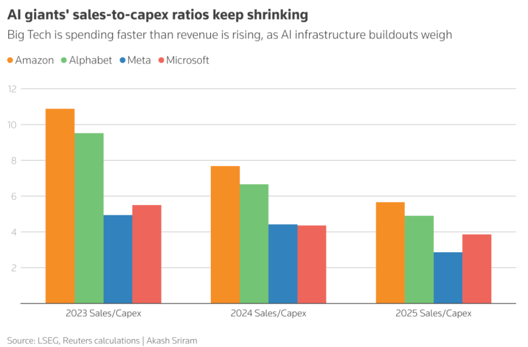 与估值泡沫相呼应的,是支出曲线的高涨。硅谷巨头的资本开支增长速度,已经远超收入增长。亚马逊、谷歌、微软、Meta与甲骨文的2026财年资本开支预算,从2025年初的3140亿美元,短短十个月提升至5168亿美元。它们必须在不断扩大的token产能之上,更快、更高效地实现货币化。