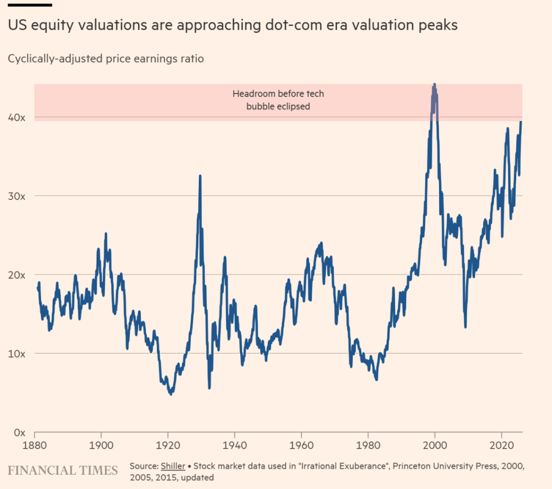 美国股市的整体估值,也正在逼近互联网泡沫的极端区间。标普500的席勒市盈率(CAPE)已攀升至近40倍,距离2000年峰值几乎没有安全冗余;市销率也超过了1999年的水平,意味着投资者为每一美元营收支付的价格比当年更高;而被巴菲特称为“衡量整体估值最可靠的指标”的巴菲特指标(总市值/GDP),已飙升至创纪录的225%,远高于近50年约85%的历史均值。