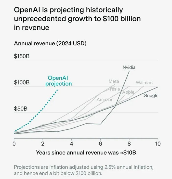 OpenAI正在创造收入增长的历史。自ChatGPT发布以来,它于2023年获得了10亿美元收入,到了2025年已经超过100亿美元,据其路线图,到2028年就能突破1000亿美元。在过去半个世纪里,只有Uber、谷歌、Cheniere Energy与Moderna等少数公司能在相似周期内实现如此陡峭的增长曲线。而过去半个世纪,从年收入100亿美元跨越1000亿美元,特斯拉和Meta用了7年,英伟达、苹果和亚马逊花了8年,沃尔玛9年,谷歌10年;OpenAI相信自己只需要3年,比中国的字节跳动的5年还要快不少。Anthropic同样预测,到2026年底,其年化收入可能达到260亿美元。