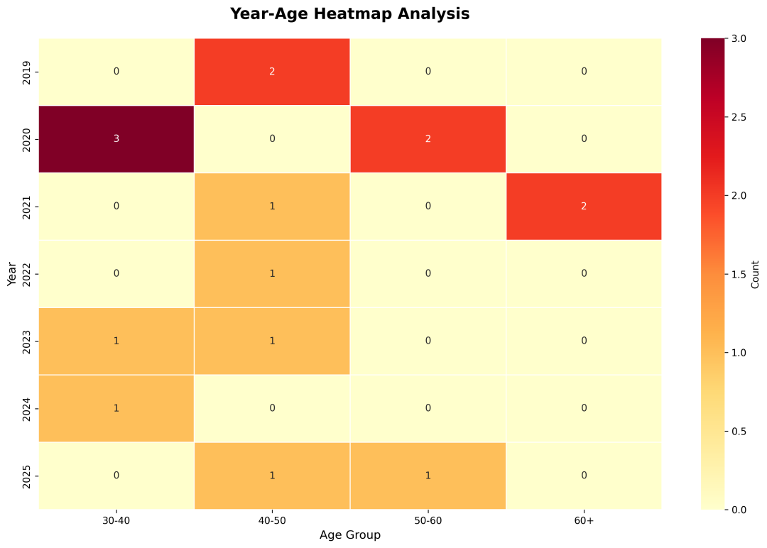 图5:年份-年龄段热力图(颜色越深案例越多)