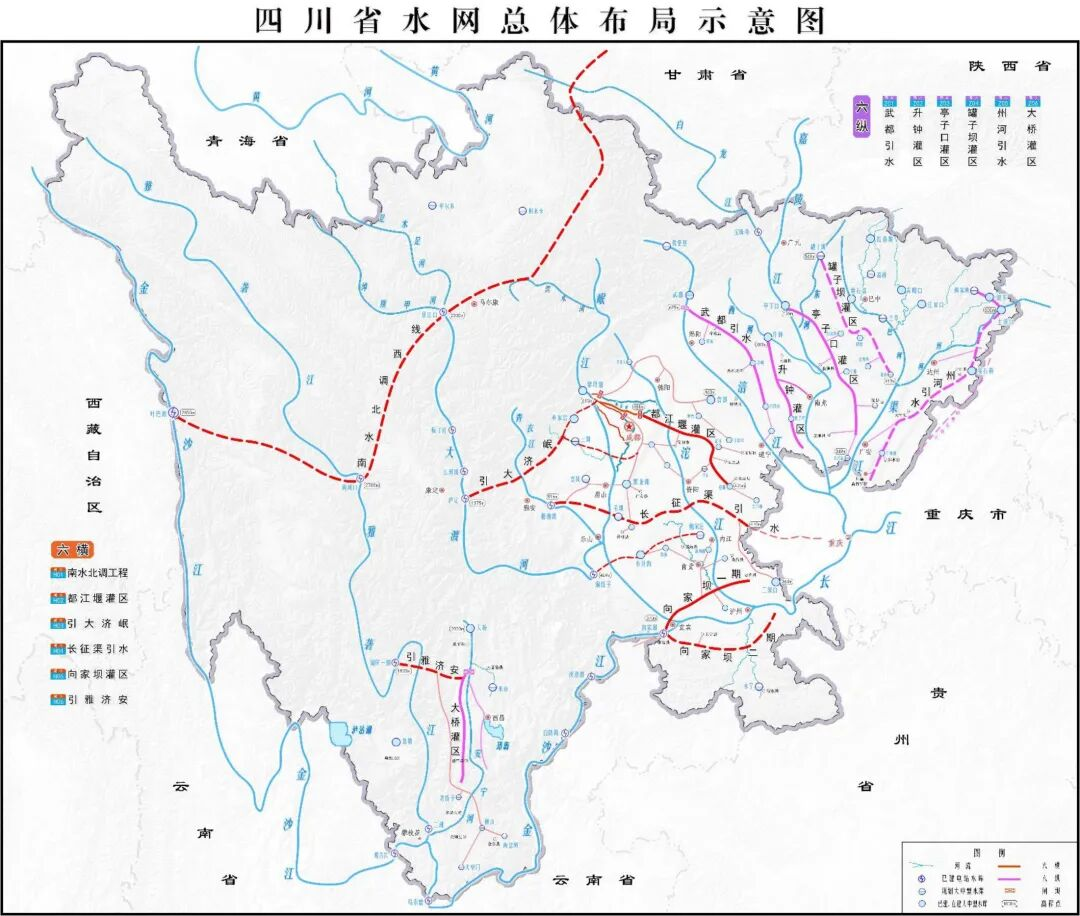 六横是都江堰、引大济岷、长征渠、向家坝、引雅济安、南水北调西线工程,六纵是武都、升钟、大桥、亭子口、罐子坝、川渝东北一体化水资源配置工程,力争到2030年骨干水网总体架构基本完成。
