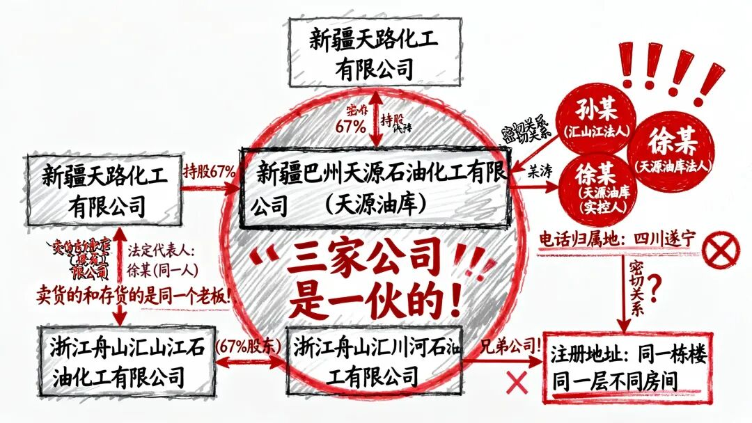 新疆天路化工是源头卖家,天源油库是储存地点,浙江舟山汇山江公司是终端买家。这三家公司,关系极为密切。
