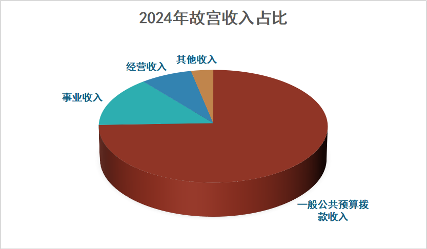 根据《故宫博物院2024年度部门决算》,故宫博物院的收入主要有五部分,在其约14.91亿元的总收入中, 最大的一部分其实是一般公共预算拨款收入和政府性基金预算财政拨款收入 ,即从中央财政取得的资金,11.11亿元,这占到了总收入的74.5%。