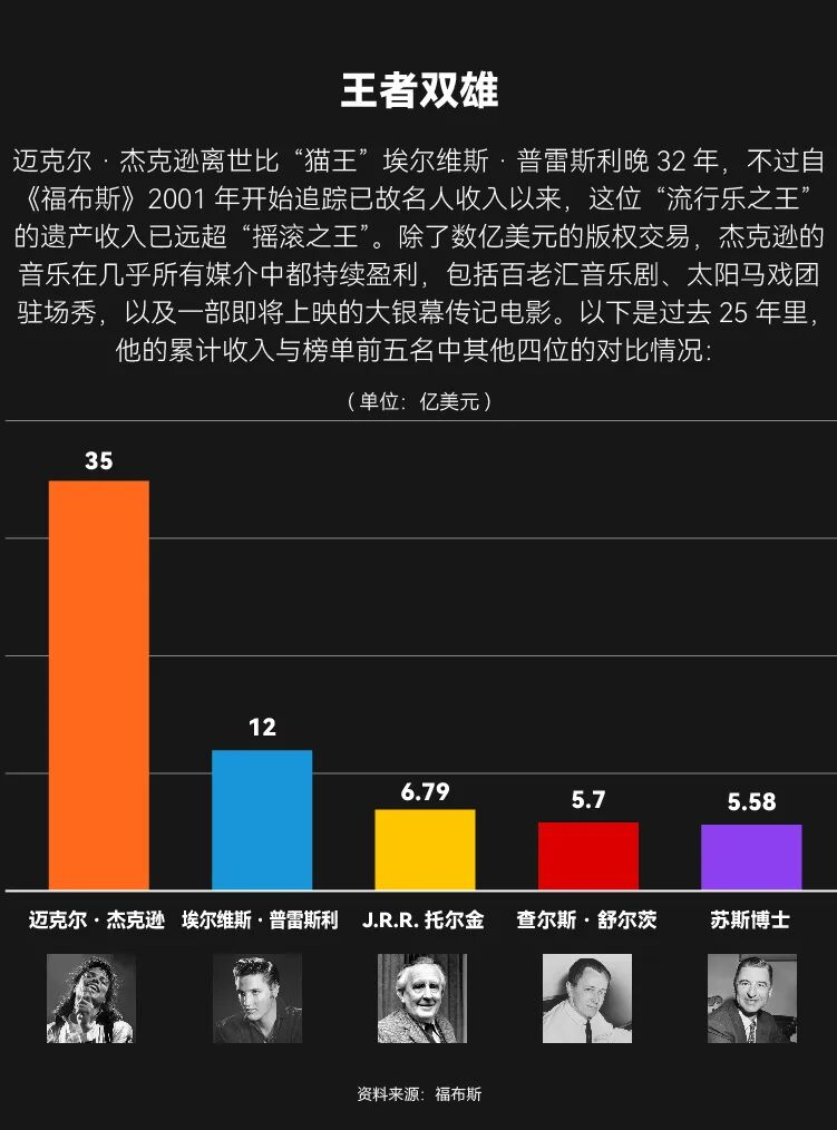2001年,“猫王”埃尔维斯·普雷斯利(Elvis Presley)登顶《福布斯》首届已故名人遗产收入榜。此后25年间,这位“摇滚之王”从未缺席任何一届榜单,累计收入超12亿美元。但真正颠覆身后收入格局的,是另一位乐坛巨匠——猫王曾经的女婿迈克尔·杰克逊。