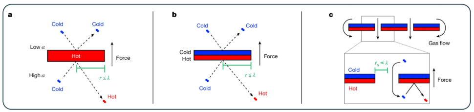 哈佛大学的本·谢弗及其团队将这一光泳现象与现代纳米技术结合,创造出了能够在阳光照射下悬浮的微型飞行器。这款飞行器的核心是由两片微孔氧化铝薄片构成,底层薄片吸收阳光并迅速升温,形成定向气流,而这一气流的方向是向上流动的。这种设计利用了类似辐射计叶片的效应,增强了升力效果。