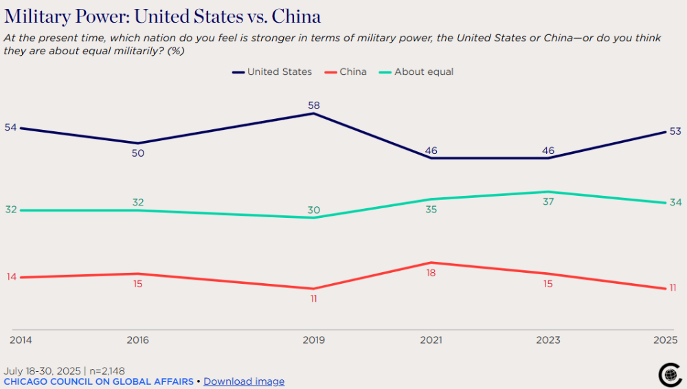 其中,共和党人普遍认为美国在军事上(63%)和经济上(50%)都比中国强大,民主党人认为美国是更强大的军事强国(51%),但对美国经济实力已经失去了信心(27%,低于2023年的39%)。