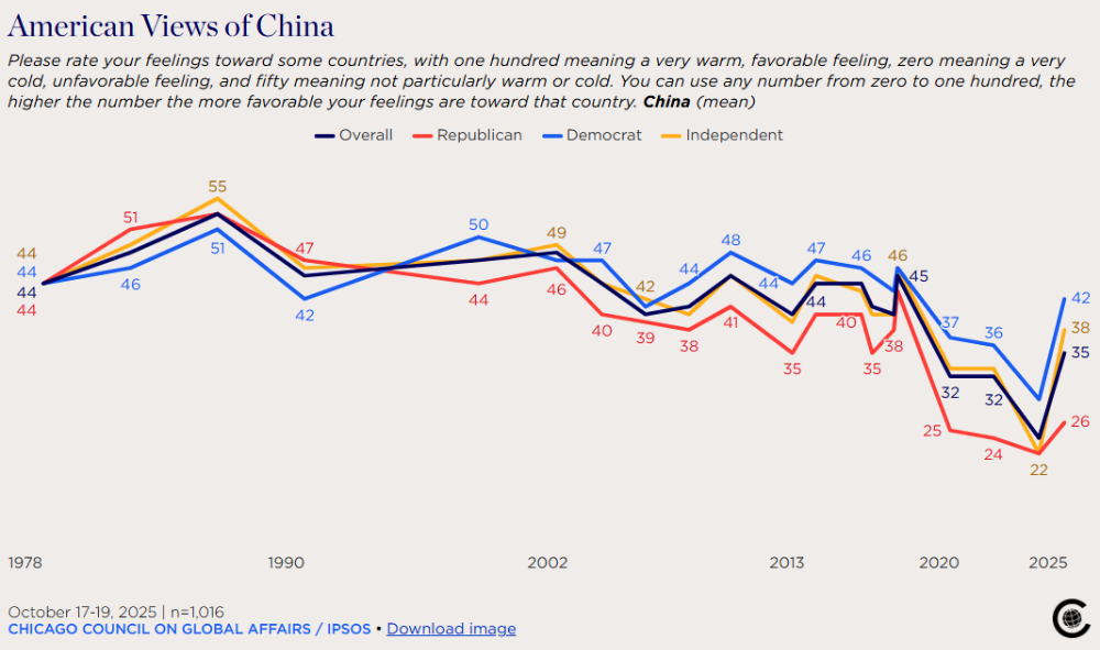 这种整体转变主要是由民主党人和独立人士推动的,结果显示,民主党人对中国的平均评分为42分,大幅高于2024年的29分;共和党人也有改善,只不过幅度不明显。