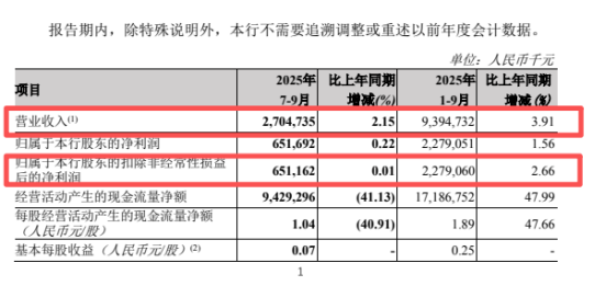 从前三季度整体数据看,营业收入同比增长3.91%,达到939.47亿元,可归属于本行股东的净利润仅微增1.56%,为22.79亿元。